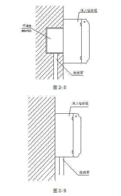 消火栓按鈕采用明裝方式,分為進(jìn)線管明裝和進(jìn)線管暗裝:進(jìn)線管暗裝時(shí)只需拔下按鈕,從底殼的進(jìn)線孔中穿入電纜并接在相應(yīng)端子上,再插好按鈕即可安裝好,安裝示意圖見(jiàn)圖2-8;進(jìn)線管明裝時(shí)只需拔下按鈕,將底殼下端的敲落孔敲開(kāi),從敲落孔中穿入電纜并接在相應(yīng)端子上,再插好按鈕即可安裝好,安裝示意圖見(jiàn)圖2-9;安裝孔距為60mm。