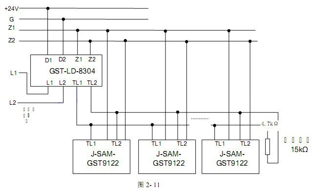 作為手動火災報警按鈕使用時,將報警按鈕的Z1、Z2端子直接接入火災報警控制器總線上即可。作為手動火災報警按鈕及消防電話插孔使用時,將報警按鈕的Z1、Z2端子直接接入火災報警控制器總線上,同時將報警按鈕的TL1、TL2端子與GST-LD-8304消防電話模塊連接,具體見圖2-11所示(*末端報警按鈕的TL1、TL2接線端子接4.7kΩ終端電阻)。