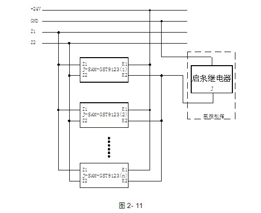 J-SAM-GST9124消火栓按鈕可以采用總線制方式啟動消防泵(參照第二章1.3節(jié)J-SAM-GST9123消火栓按鈕),也可以采用多線制方式直接啟動消防泵,應(yīng)用示意圖如圖2-13。