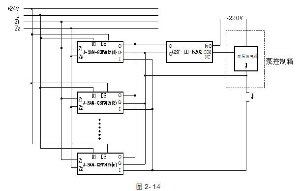 當(dāng)設(shè)備啟動電流大于100mA時,應(yīng)通過GST-LD-8302切換模塊進(jìn)行轉(zhuǎn)換,通過GST-LD-8302轉(zhuǎn)換直接啟泵方式應(yīng)用示意圖如圖2-14所示: