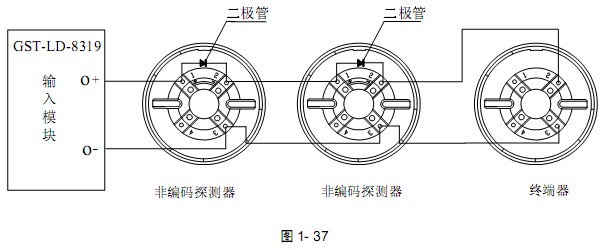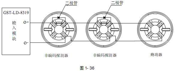 GST-LD-8319輸入模塊與非編碼探測(cè)器串聯(lián)連接時(shí),探測(cè)器的底座上應(yīng)接二極管 1N5819,且輸出回路終端必須接GST-LD-8320或GST-LD-8320A終端器,終端器可當(dāng)探測(cè)器底座使用,即在此終端器上可安裝非編碼探測(cè)器,其系統(tǒng)構(gòu)成圖如圖1- 36:
