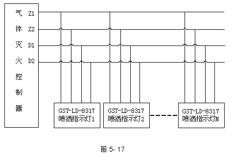 噴灑燈與氣體滅火控制器的總線和電源DC24V相連,實(shí)現(xiàn)噴灑噴灑功能。具體連接方法如圖5-17所示。