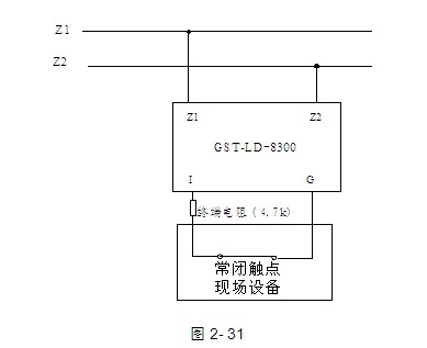 GST-LD-8300型海灣輸入模塊與具有常閉無(wú)源觸點(diǎn)的現(xiàn)場(chǎng)設(shè)備連接方法如圖2-31所示,模塊輸入設(shè)定參數(shù)設(shè)為常閉檢線。
